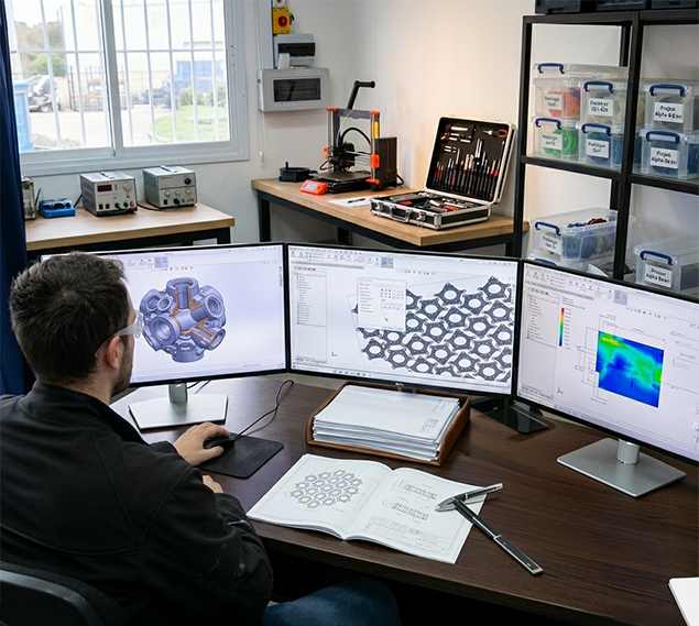 מחלקת ההנדסה שלנו מתמחה בתכנון תבניות ובבניית תהליכי ייצור מדויקים ויעילים. אנו מבצעים אפיון חומרים מעמיק והתאמה מדויקת לדרישות ההנדסיות של כל פרויקט, משלב הקונספט ועד הייצור. השימוש בתוכנות אנליזה מתקדמות מאפשר לנו לבצע אופטימיזציה של התכנון, לשפר תהליכים קיימים ולהבטיח פתרון אמין, מדויק וניתן לייצור סדרתי.